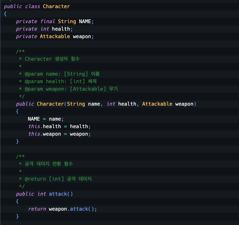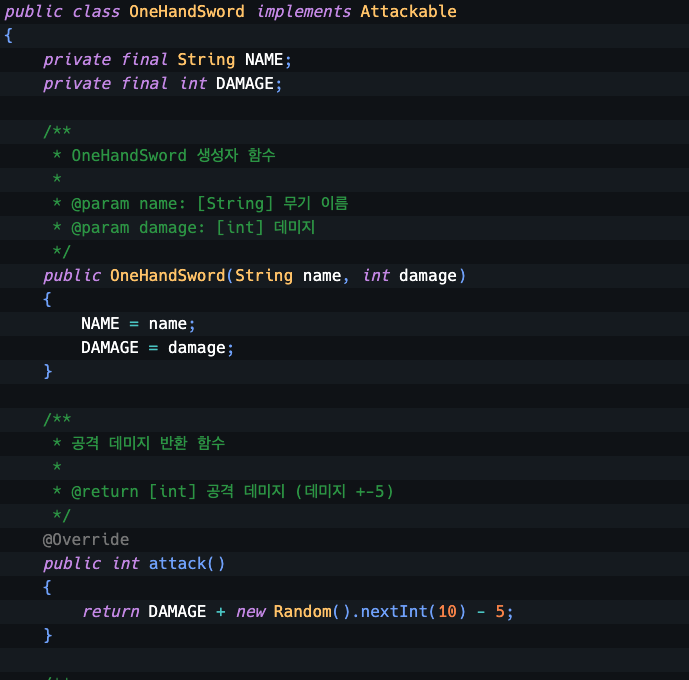 사용하는 클래스에서는 필요한 것만 추출해서 쓸수있게, 즉, 인터페이스로 뽑아서 사용함으로서 확장성이 유연해지고 onehandsword뿐만이 아닌 다른 무기도 추가해서 사용할수 있게 되는 것이다.