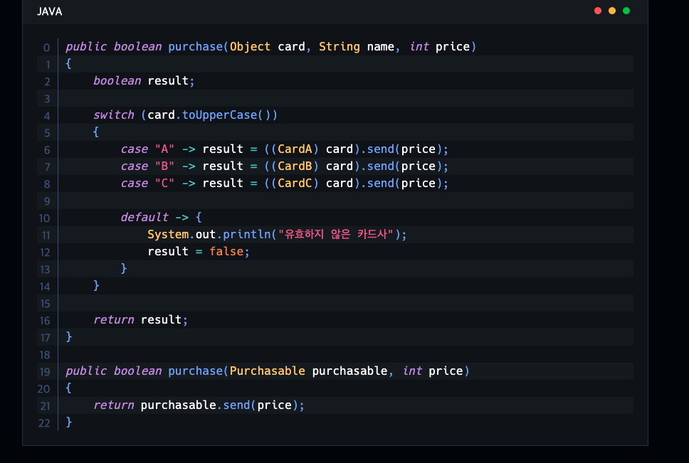 purchase 함수에서 새로운 케이스가 나올때마다 추가를 하는게 아니라 purchasable이라는 인터페이스로 뽑아서 사용하면, 다른 카드에서 사용하는 purchasable을 사용할수 있기 때문에 효율적이다.