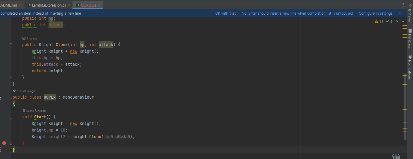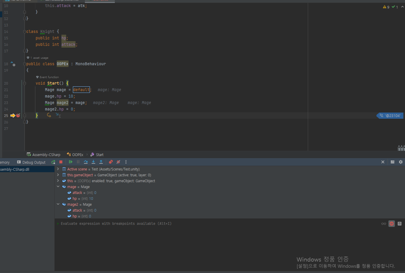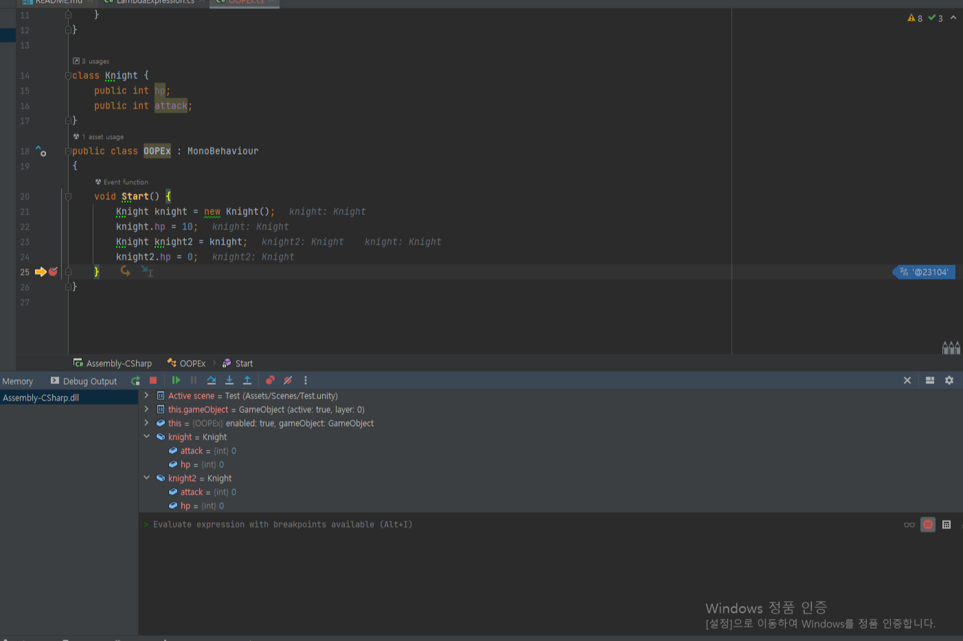 Knight는 클래스로 정의하였고, 위의 Mage와는 다른 것을 볼수 있다. -> 참조 타입의 경우 knight의 주소에 knight2가 같이 사용하게 되었기 때문이다. 위의 값타입은 다른 주소를 가지고 있게 되는 것이 다르다.