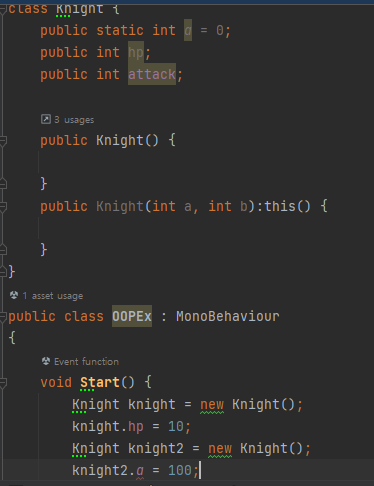 a는 Knight클래스에 종속되어 있는 변수 인데, 거기에 access할려고 하니 instance에 해당되는 친구들은 어디를 가야 할지 모르니 할당이 불가하다.(쉽게 말해, 어디가 주소 인지 몰라 찾아갈수 없다) 대신 knight2나 knight에는 a가 같은 값으로 존재한다. 우리가 클래스의 인스천스끼리 공유 되었으면 하는 값에 사용하면 좋은 방식이다.