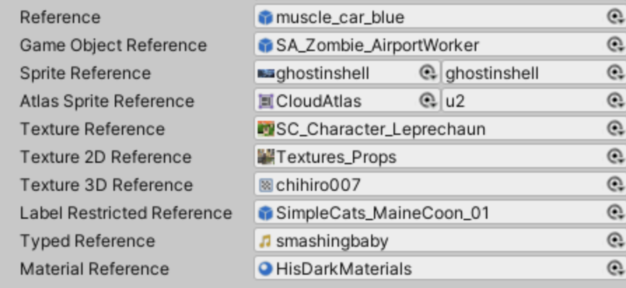 MonoBehaviour 또는 ScriptableObject에서 AssetReference 클래스를 사용합니다. 이러한 클래스 중 하나에 serialize 가능한 AssetReference 필드를 추가하면 인스펙터 창에서 필드에 값을 할당할 수 있습니다. 유형 및 레이블별로 할당할 수 있는 에셋을 제한할 수 있습니다.