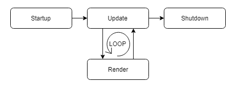 그래서 게임엔진의 주기를 살펴보면, 크게 시작 loop 종료 이렇게 세가지이다. 여기서 세분화가 되는 건데, 밑에 그림을 보시면 초기화 업데이트 화면 출력 순서로 반복이 되는 것을 확인 할수 있다.