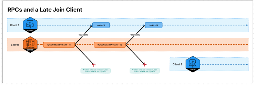 예를 들어 폭발 같은 일시적인 이벤트의 경우, 이를 위해 복제된 상태를 사용할 필요가 없다. 이는 의미가 없다. 모든 새로운 플레이어가 연결될 때마다 "폭발되지 않은" 상태를 동기화해야 하는데, 이러한 이벤트를 상태로 나타내는 것은 설계적으로 바람직하지 않기 때문이다.