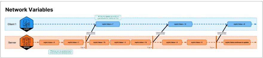 NetworkVariables는 최종적으로 일관성을 갖는다. 이는 RPC와는 다르게 모든 값 변경이 동기화되지 않는다는 것을 의미한다. RPC는 5회의 RPC 호출이 네트워크 상에서 5개의 RPC 전송을 생성하는 반면, NetworkVariables는 모든 값 변경이 네트워크에 동기화되지 않을 수 있음을 의미