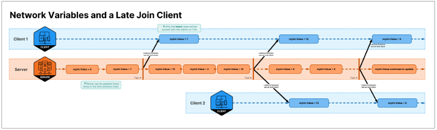 NetworkVariables는 상태를 관리하고 모든 플레이어가 최신 값을 갖도록 하는 데 좋다. 최근에 연결된 플레이어가 최신 세계 상태를 받아야 할 때 사용하자