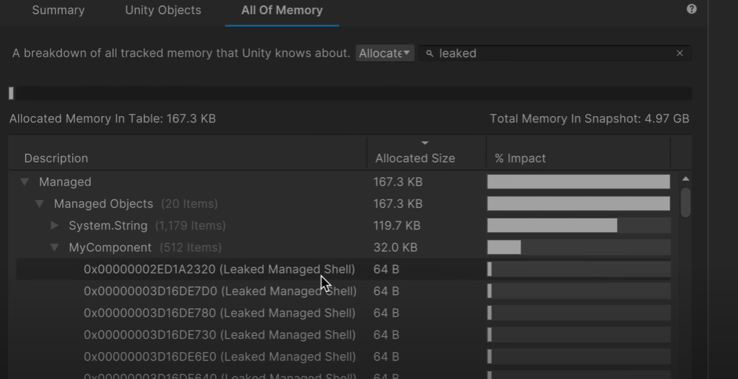 기존의 profiler를 통해서는 이 memory leak이 어디서 발생하는 지 알기 어려웠다. 하지만, Memory Profiler라는 강력한 툴을 유니티에서 제공함으로서, 발생 근원지와 두 시점의 메모리 사용 차이를 보여줌으로서, 메모리 최적화에 큰 도움을 주고 있다. (leaked를 처보면 wrapper object(managed shell은 c#영역을 의미)가 남아있는 것을 확인할수가 있다.)