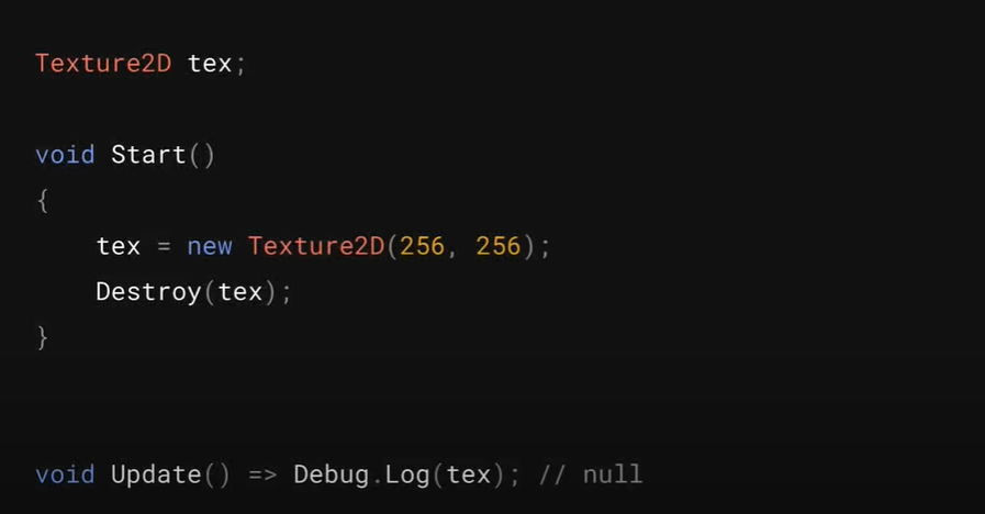 When you do this in Unity: if (myGameObject == null) {} Unity does something special with the == operator. Instead of what most people would expect, we have a special implementation of the == operator. This serves two purposes: 1) When a MonoBehaviour has