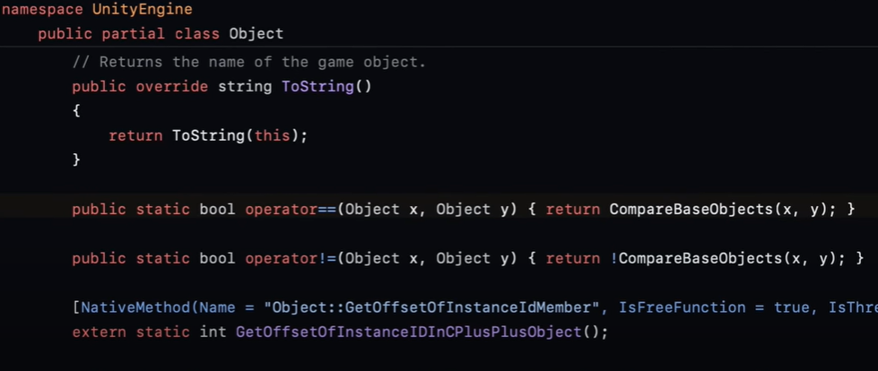 이게 어떻게 가능한 것인가. 유니티 object클래스를 보면 custom operator == 가 overloaing 되어 있는 것을 확인 할수가 있다. 그래서, 실질적인 Wrapper object가 null이 아니더라도, fake null object를 비교하여 null로서 보이게 되는 것이다.